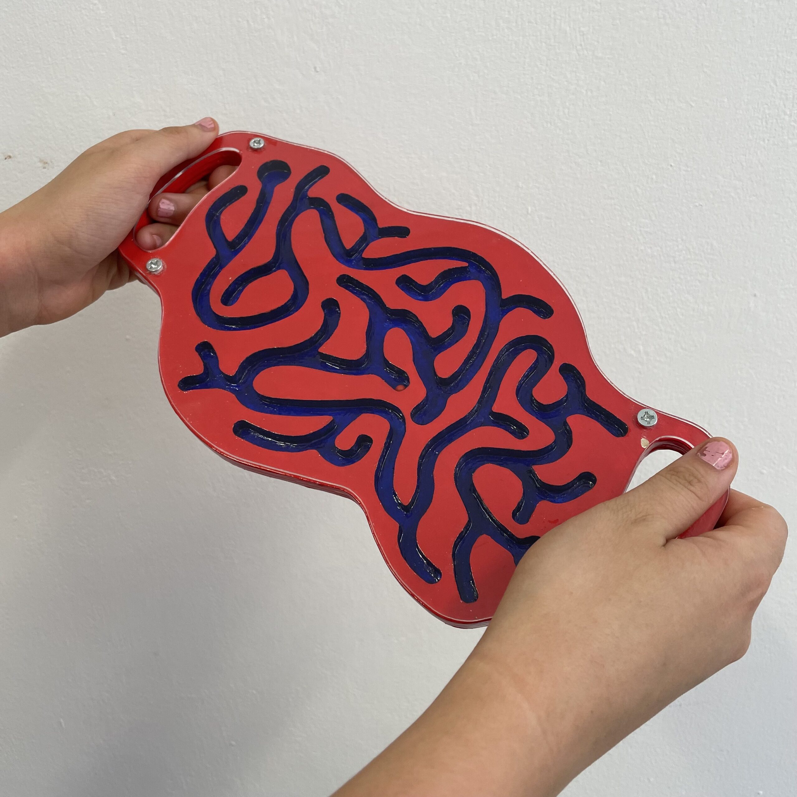 Handheld maze: Providing the audience with a challenge, this work encourages the viewer to physically hold the work and focus on their present movements as they concentrate on the game. Being prompted to hold the two handles and gently adjust their angle to get the bead from one end of the vein to the other, this work aims to highlight the intricacy of miniature forms of motion.