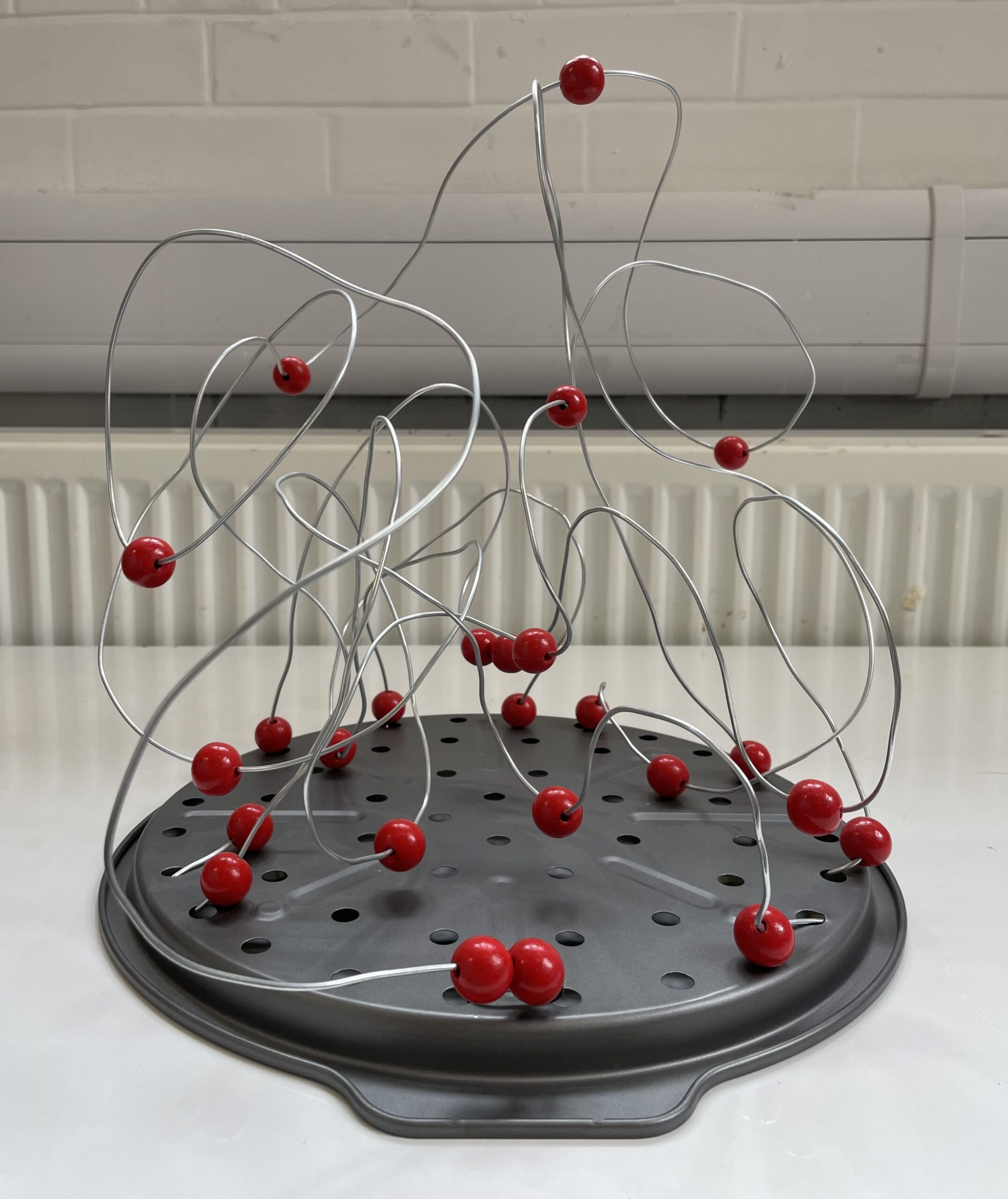 Beaded maze: Involving interactions of sliding the bead along the wire, the tangled maze gives a sculptural twist on the movement of atomic particles through space.